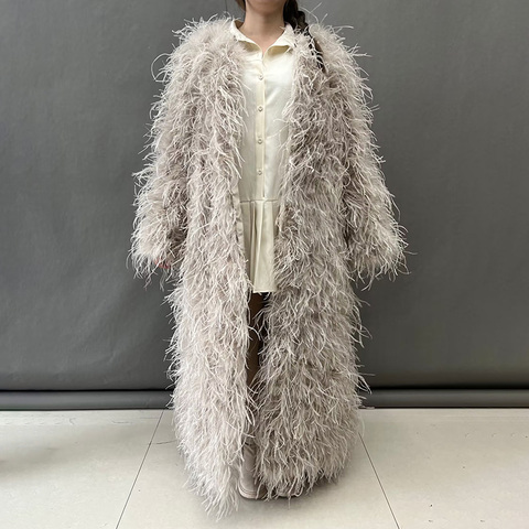 Luxury Women's Ostrich Feather Coat Solid Color Long Fur Wool Lining Custom Length Fluffy Trench for Winter Plain Dyed Nonwoven